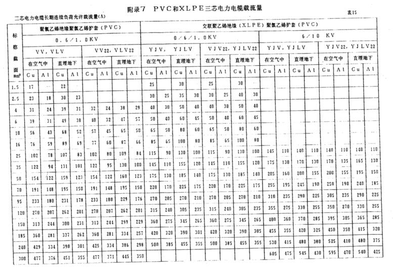 說明:三芯電力電纜1~10KV XLPE和PVC電力電纜線芯允許長期最高工作溫度分別為90℃和70℃。XLPE電纜短時過載溫度不超過130℃,短路溫度不超過250℃,持續(xù)最長時間不超過5S。PVC電纜短路溫度不超過150℃,持續(xù)最長時間不超過5S,電纜敷設(shè)溫度應(yīng)不低于0℃。三芯電纜彎曲半徑≥10D,連續(xù)負荷允許載流量數(shù)據(jù)是在以下運行方式下測量所得: