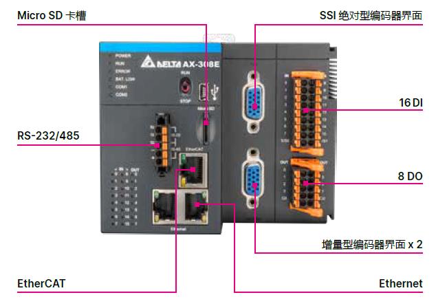 ● 內置6?~?16 DI?/?6?~?8 DO、增量型編碼器、SSI絕對型編碼器、RS-232/422?/?485、Ethernet與EtherCAT等界面
